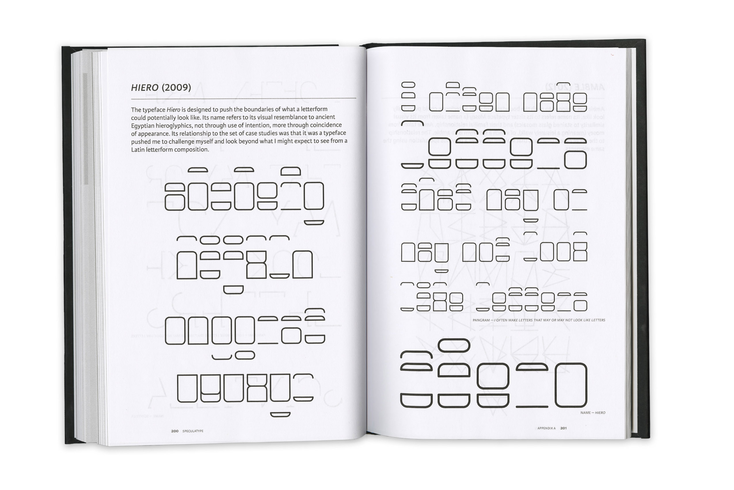 Hiero is a character set that imagines letters in the Latin script as roughly square, three-dimensional sculptures that can be horizontally rotated. The typeface addresses the hypothetical notion that the letterforms of the Latin alphabet, as we know them, are actually profile representations of the “real” letterforms, which in Hiero have been corrected to now face the front. Ultimately, the characters in this writing system are built out of ten elements that are repeated, rotated, expanded, or contracted. This type of exploration parallels the content found in J. Abbott Miller’s Dimensional Typography (1996) and the idea that letterforms can be investigated beyond their expected “flat” appearance. Hiero takes its name from the word “hieroglyph,” meaning sacred engraving or carving, and was inspired by observing Egyptian hieroglyphics. The project was accompanied by Speculatype (2017), a book that presents the designer’s typographic explorations with Latin letterforms, offering in-depth case studies and information about the inspiration and process behind them.