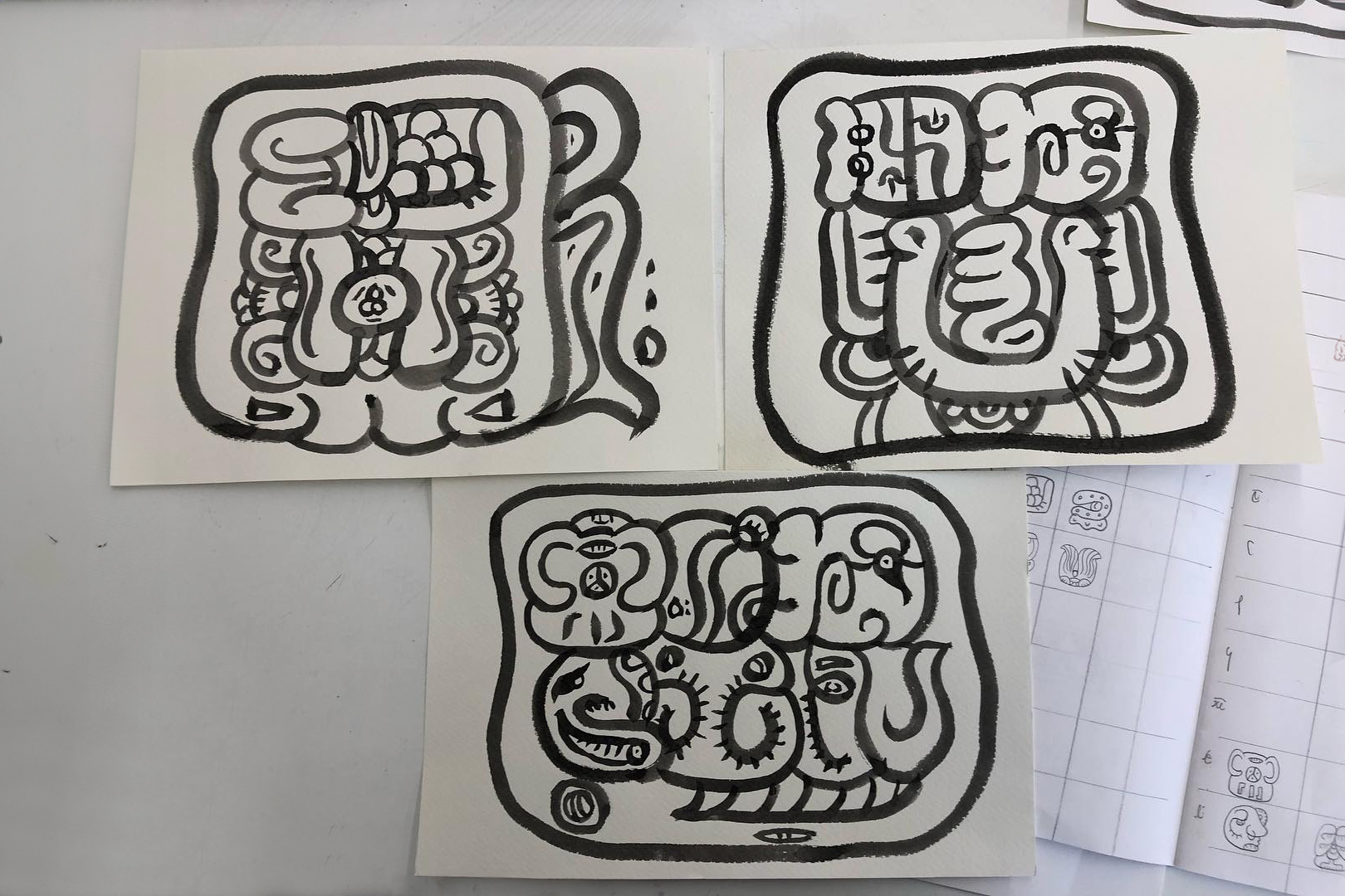 Masetzu Logosyllabary is a fictional script inspired by the ancient Mayan writing system of Mesoamerica. This writing system combines the characteristics of syllabaries and logographies, using modular images to represent objects and concepts. The challenges lay in creating distinctive symbols to represent the thousands of consonant-vowel combinations in English, while allowing these symbols to convey broader meanings. These symbols are richly rooted in the physical world, encompassing depictions of human organs, abstract figures, plants, animals, and man-made objects. Masetzu distinguishes itself from the original Mayan script by incorporating “shells” that surround the characters to define the parts of speech (nouns, verbs, adjectives, etc.) and small “tags” to signify when a symbol should be interpreted symbolically rather than phonetically. This project extends the script’s artistic expression into other media, such as ceramic sculptures and abstract art, fostering a dialogue between tradition and modernity.